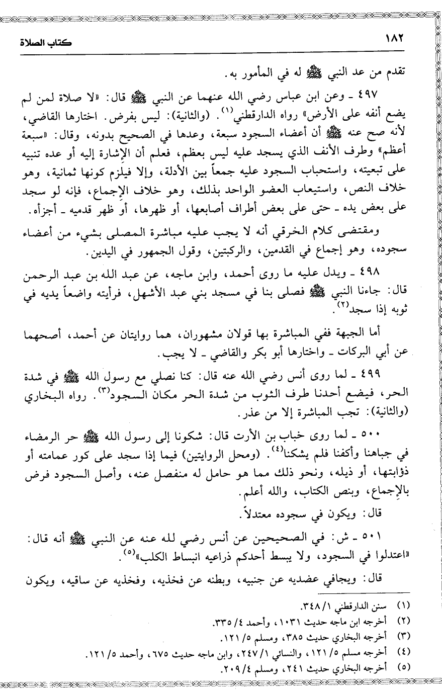497 وعن ابن عباس [ رضي الله عنهما ] عن النبي [ ] قال : ( لا صلاة لمن لم يضع أنفه على الأرض ) رواه الدارقطني . ( والثانية ) : ليس بفرض . اختارها القاضي ، لأنه صح عنه أن أعضاء السجود سبعة ، وعدها في الصحيح بدونه ، وقال : ( سبعة أعظم ) وطرف الأنف الذي يسجد عليه ليس بعظم ، فعلم أن الإِسارة إليه أو عده تنبيه على تبعيته ، واستحباب السجود عليه جمعاً بين الأدلة ، وإلا فيلزم كونها ثمانية ، وهو خلاف النص ، واستيعاب العضو الواحد بذلك ، وهو خلاف الإِجماع ، فإنه لو سجد على بعض يده حتى