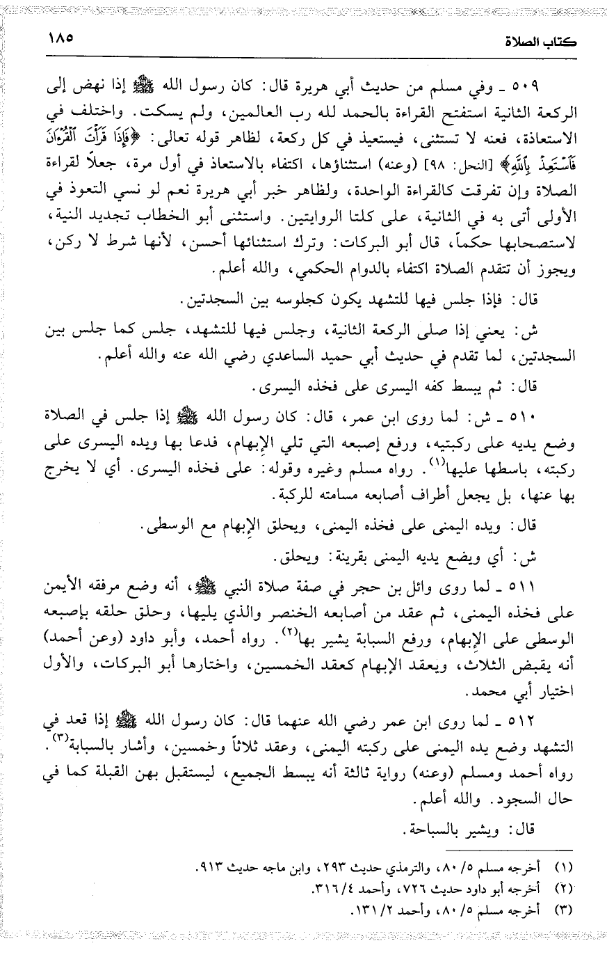 510 ش : لما روى ابن عمر ، قال : كان رسول الله إذا جلس في الصلاة وضع يديه على ركبتيه ، ورفع إصبعه التي تلي الإِبهام ، فدعا بها ويده اليسرى على ركبته ، باسطها عليها . رواه مسلم وغيره وقوله : على فخذه اليسرى . أي لا يخرج بها عنها ، بل يجعل أطراف أصابعه [ مسامته ] للركبة [ والله أعلم ] .