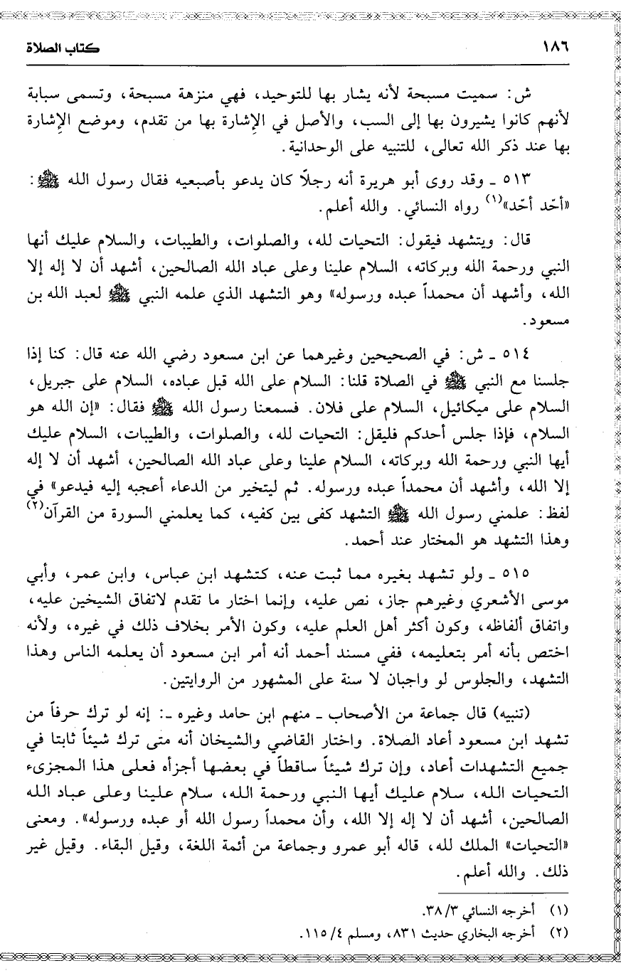 514 ش : في الصحيحين وغيرهما عن ابن مسعود [ رضي الله عنه ] قال : كنا إذا جلسنا مع النبي [ في الصلاة ] قلنا : السلام على الله قبل عباده ، السلام على جبريل ، السلام على ميكائيل ، السلام على فلان . فسمعنا رسول الله فقال : ( إن الله هو السلام ، فإذا جلس أحدكم فليقل : التحيات لله ، والصلوات ، والطيبات ، السلام عليك أيها النبي ورحمة الله وبركاته ، السلام علينا وعلى عباد الله الصالحين ، أشهد أن لا إله إلا الله ، وأشهد أن محمداً عبده ورسوله . ثم ليتخير من الدعاء أعجبه إليه فيدعو ) في لفظ : علمني رسول الله [ ] التشهد كفى بين كفيه ، كما يعلمني السورة من القرآن وهذا التشهد هو المختار عند أحمد .