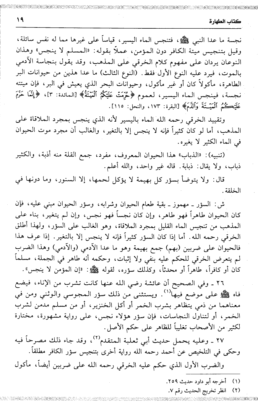ش : السؤر مهموز بقية طعام الحيوان وشرابه ، وسؤر الحيوان مبني عليه ، فإن كان الحيوان طاهراً فهو طاهر ، وإن كان نجساً فهو نجس ، وإن لم يتغير ، بناء على المذهب من تنجيس الماء القليل بمجرد الملاقاة ، وهو الغالب على السؤر ، ولهذا أطلق الخرقي رحمه الله . أما إذا كان السؤر كثيراً فإنه لا ينجس إلا بالتغير . إذا عرف هذا فالحيوان على ضربين ( بهم ) جمع بهيمة وهو ما عدا الآدمي ( والآدمي ) وهذا الضرب لم يتعرض الخرقي للحكم عليه بنفي ولا إثبات ، وحكمه أنه طاهر في الجملة ، مسلماً كان أو كافراً ، طاهراً أو محدثاً ، وكذلك سؤره ، لقوله : ( إن المؤمن لا ينجس ) .