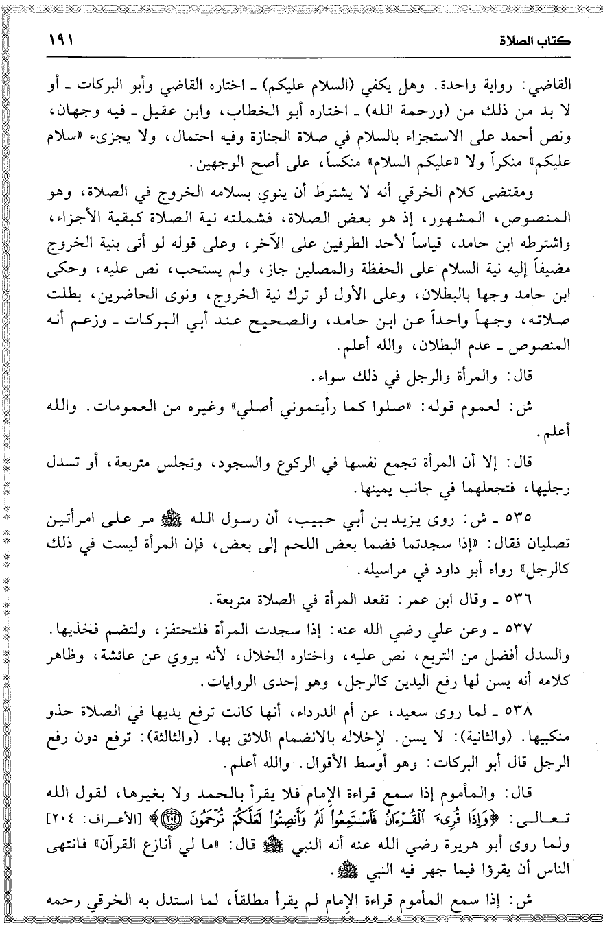 القاضي : رواية واحدة . وهل يكفي ( السلام عليكم ) اختاره القاضي وأبو البركات أو لا بد من ذلك من ( ورحمة الله ) اختاره أبو الخطاب ، وابن عقيل فيه وجهان ، ونص أحمد على الإِستجزاء بالسلام في صلاة الجنازة وفيه احتمال ، ولا يجزيء ( سلام عليكم ) منكراً ولا ( عليكم السلام ) منكساً ، على أصح الوجهين .