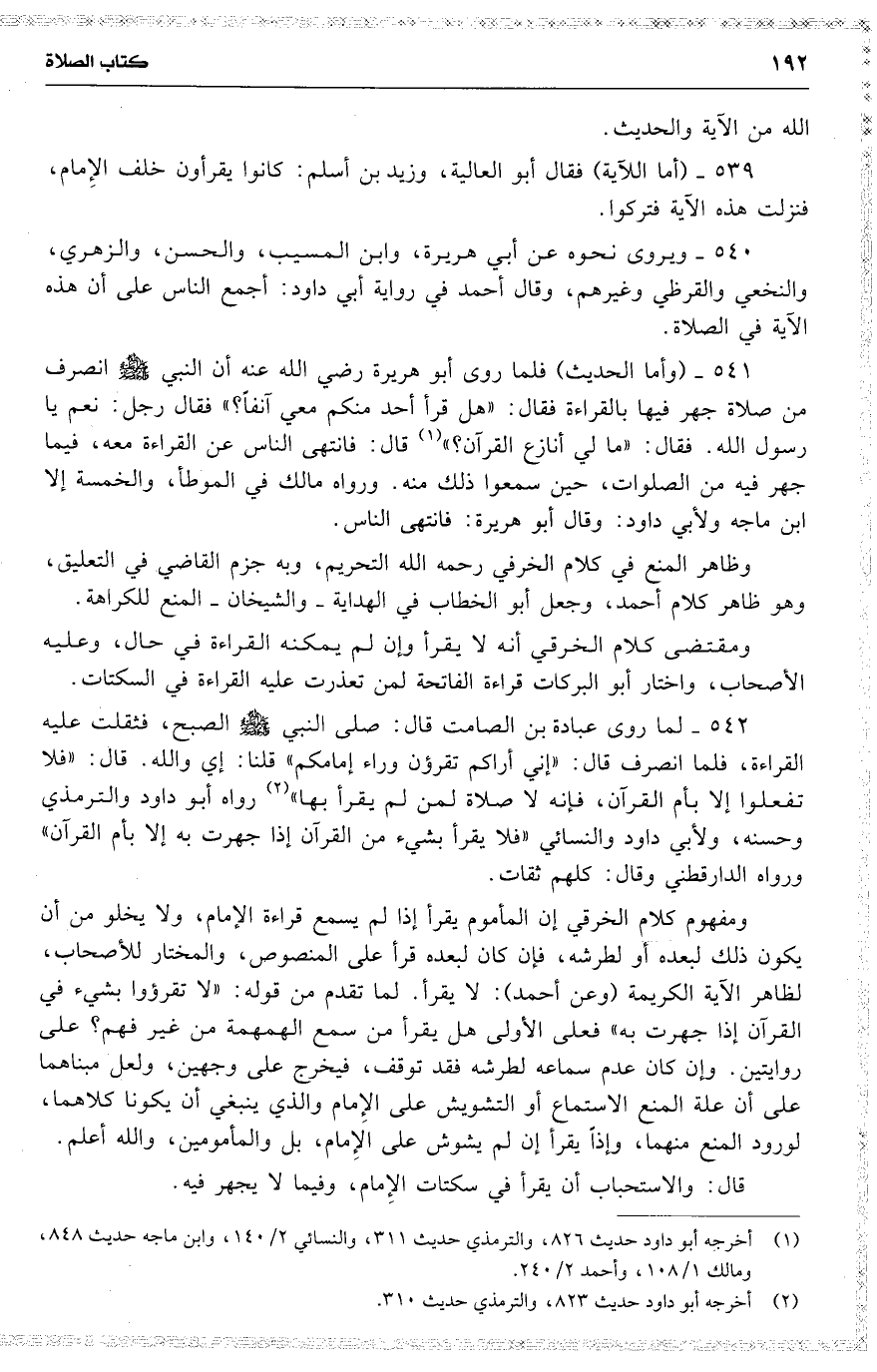 542 لما روى عبادة بن الصامت قال : صلى النبي [ ] الصبح ، فثقلت عليه القراءة ، فلما انصرف قال : ( إني أراكم تقرؤن وراء إمامكم ) قلنا : إي والله . قال : ( فلا تفعلوا إلا بأم القرآن ، فإنه لا صلاة لمن لم يقرأ بها ) رواه أبو داود والترمذي وحسنه ، ولأبي داود والنسائي ( فلا يقرأ بشيء من القرآن إذا جهرت به إلا بأم القرآن ) ورواه الدارقطني وقال : كلهم ثقات .