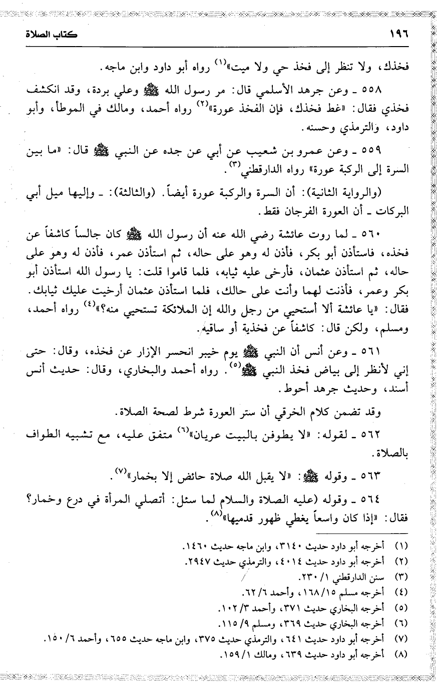 558 وعن جرهد الأسلمي قال : مر رسول الله وعلي بردة ، وقد انكشف فخذي فقال : ( غط فخذك ، فإن الفخذ عورة ) رواه أحمد ، ومالك في الموطأ ، وأبو داود ، والترمذي وحسنه .