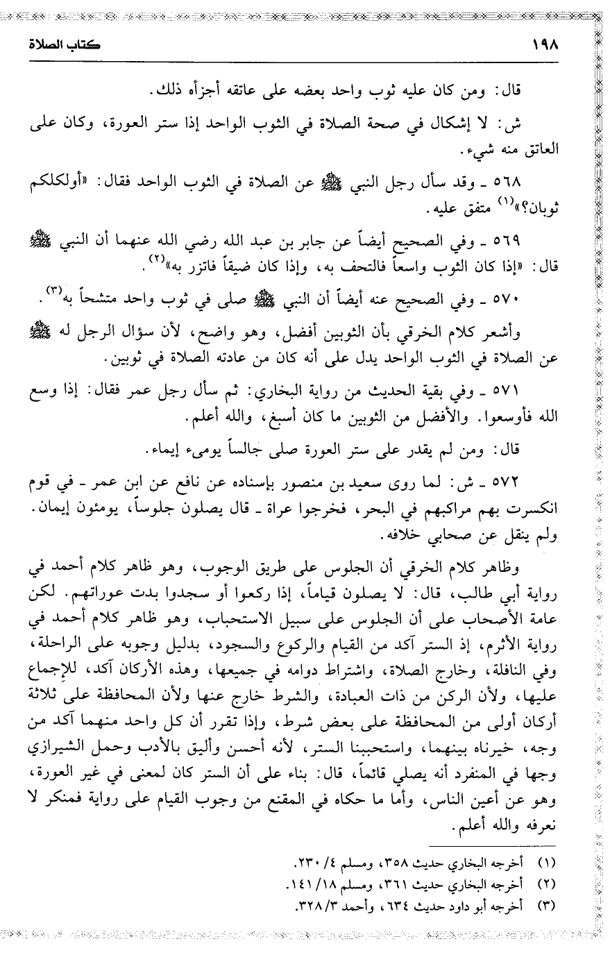 569 وفي الصحيح أيضاً عن جابر بن عبد الله [ رضي الله عنهما ] أن النبي قال : ( إذا كان الثوب واسعاً فالتحف به ، وإذا كان ضيقاً فاتزر به ) .