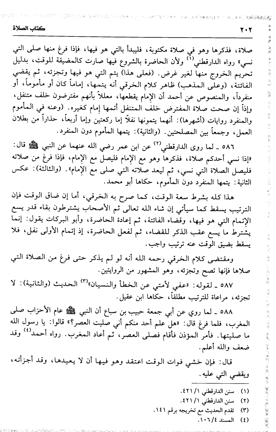 586 لما روى الدارقطني عن ابن عمر [ رضي الله عنهما ] عن النبي قال : ( إذا نسي أحدكم صلاة ، فذكرها وهو مع الإِمام فليصل مع الإِمام ، فإذا فرغ من صلاته فليصل التي نسي ، ثم ليعد صلاته التي صلى مع الإِمام ) . ( والثالثة ) : عكس الثانية : يتمها المنفرد دون المأموم ، حكاها أبو محمد .