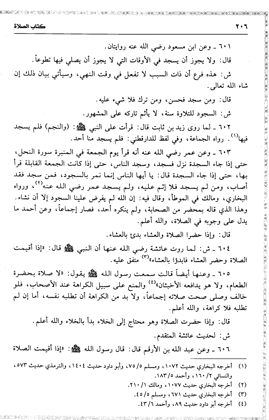 605 وعنها أيضاً قالت سمعت رسول الله يقول : ( لا صلاة بحضرة الطعام ، ولا هو يدافعه الأخبثان ) والمنع على سبيل الكراهة عند الأصحاب ، فلو خالف وصلى صحت صلاته إجماعاً ، ولا بد من الكراهة أن تطلبه نفسه ، أما إن لم تطلبه فلا كراهة ، والله أعلم .