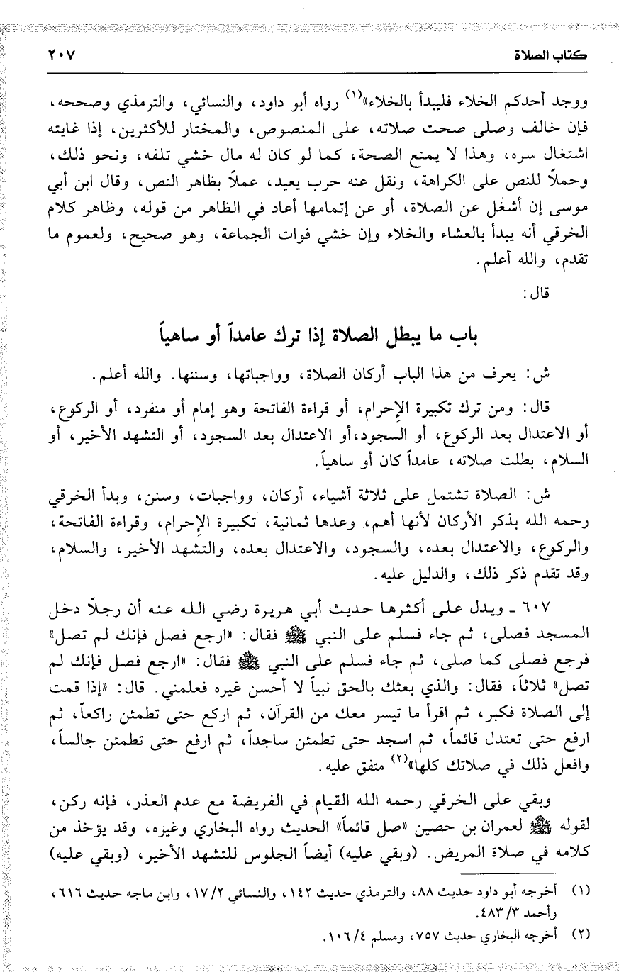 607 ويدل على أكثرها حديث أبي هريرة رضي الله عنه أن رجلًا دخل المسجد فصلى ، ثم جاء فسلم على النبي [ ] فقال : ( ارجع فصل فإنك لم تصل ) فرجع فصلى كما صلى ، ثم جاء فسلم على النبي [ ] فقال : ( ارجع فصل فإنك لم تصل ) ثلاثاً ، فقال : والذي بعثك بالحق نبياً لا أحسن غيره فعلمني . قال : ( إذا قمت [ إلى ] الصلاة فكبر ، ثم اقرأ ما تيسر معك من القرآن ، ثم اركع حتى تطمئن راكعاً ، ثم ارفع حتى تعتدل قائماً ، ثم اسجد حتى تطمئن ساجداً ، ثم ارفع حتى تطمئن جالساً ، وافعل ذلك في صلاتك كلها ) متفق عليه .