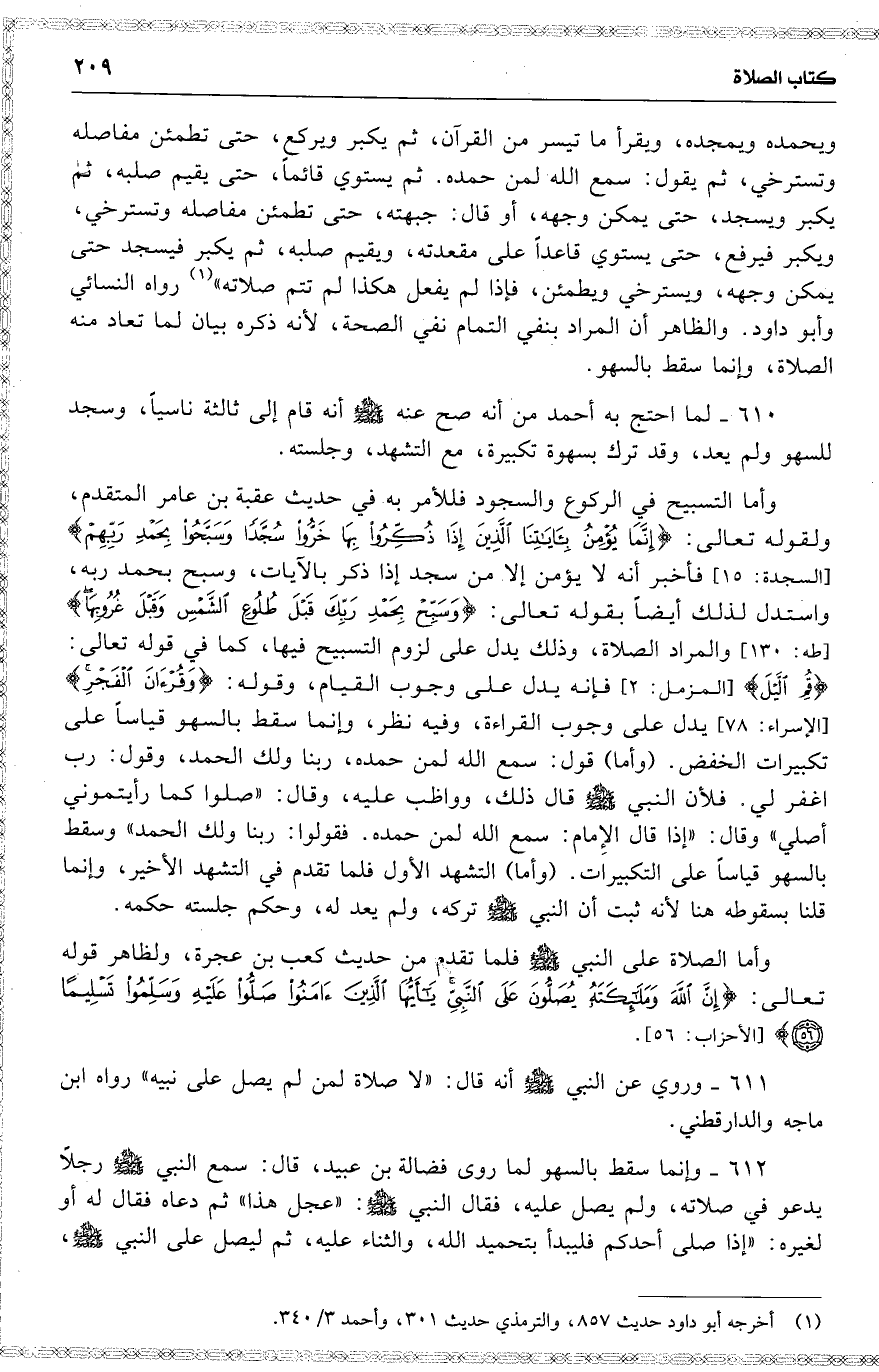 610 لما احتج به أحمد من أنه عنه أنه قام إلى ثالثة ناسياً ، وسجد للسهو ولم يعد ، وقد ترك بسهوة تكبيرة ، مع التشهد ، وجلسته .