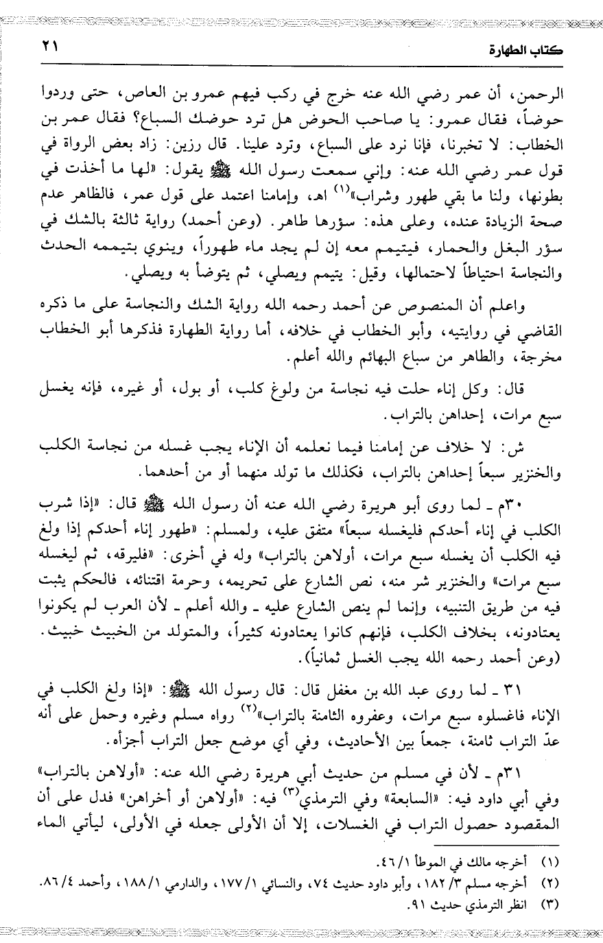 30 م لما روى أبو هريرة رضي الله عنه أن رسول الله قال : ( إذا شرب الكلب في إناء أحدكم فليغسله سبعاً ) متفق عليه ، ولمسلم : ( طهور إناء أحدكم إذا ولغ فيه الكلب أن يغسله سبع مرات ، أولاهن بالتراب ) وله في أخرى : ( فليرقه ، ثم ليغسله سبع مرات ) والخنزير شر منه ، نص الشارع على تحريمه ، وحرمة اقتنائه ، فالحكم يثبت فيه من طريق التنبيه ، وإنما لم ينص الشارع عليه والله أعلم لأن العرب لم يكونوا يعتادونه ، بخلاف الكلب ، فإنهم كانوا يعتادونه كثيراً ، والمتولد من الخبيث خبيث . ( وعن أحمد رحمه الله يجب الغسل ثمانياً ) .
