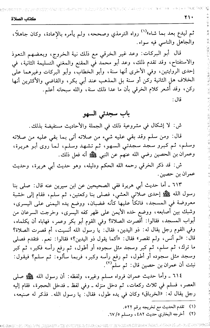 ش : قد ذكر الخرقي رحمه الله الحكم ودليله ، وهو حديث أبي هريرة ، وحديث عمران بن حصين .