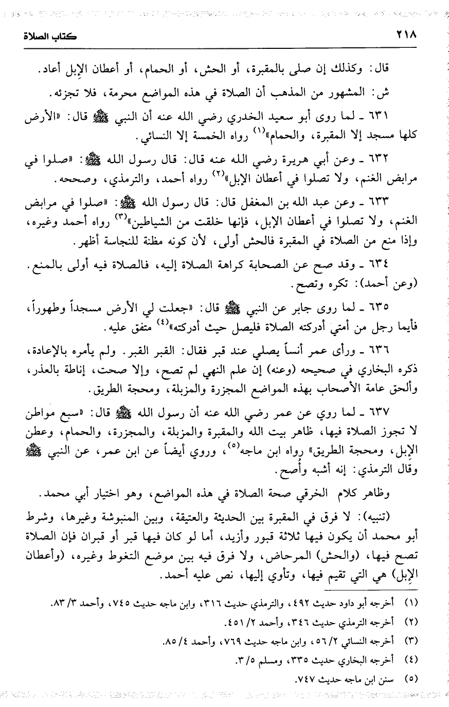 (تنبيه): لا فرق في المقبرة بين الحديثة والعتيقة، وبين المنبوشة وغيرها، وشرط أبو محمد أن يكون فيها ثلاثة قبور وأزيد، أما لو كان فيها قبر أو قبران فإن الصلاة تصح فيها، (والحش) المرحاض، ولا فرق فيه بين موضع التغوط وغيره، (وأعطان الإِبل) هي التي تقيم فيها، وتأوي إليها، نص عليه أحمد.
