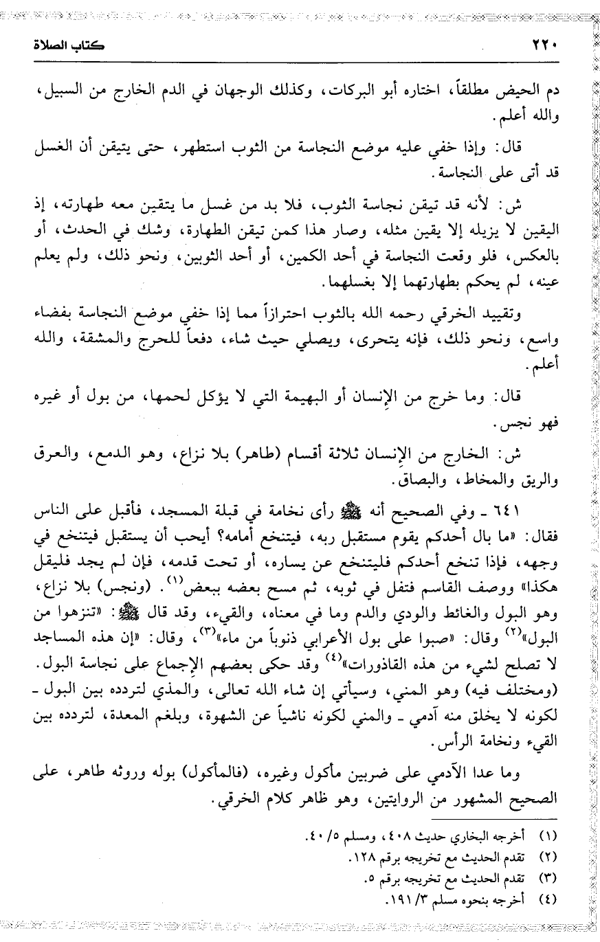 641 وفي الصحيح أنه رأى نخامة في قبلة المسجد ، فأقبل على الناس فقال : ( ما بال أحدكم يقوم مستقبل ربه ، فيتنخع [ أمامه ؟ أيحب أن يستقبل فيتنخع ] في وجهه ، فإذا تنخع أحدكم فليتنخع عن يساره ، أو تحت قدمه ، فإن لم يجد فليقل هكذا ) ووصف القاسم فتفل في ثوبه ، ثم مسح بعضه ببعض . ( ونجس ) بلا نزاع ، وهو البول والودي والدم وما في معناه ، والقيء ، وقد قال : ( تنزهوا من البول ) وقال : ( صبوا على بول الأعرابي ذنوباً من ماء ) ، وقال : ( إن هذه المساجد لا تصلح لشيء من هذه القاذورات ) وقد حكى بعضهم الإِجماع على نجاسة البول . ( ومختلف فيه ) وهو المني ، وسيأتي إن شاء الله تعالى ، والمذي لتردده بين البول لكونه لا يخلق منه آدمي والمني [ لكونه ناشياً عن الشهوة ، وبلغم المعدة ، لتردده بين القيء ونخامة الرأس ] .