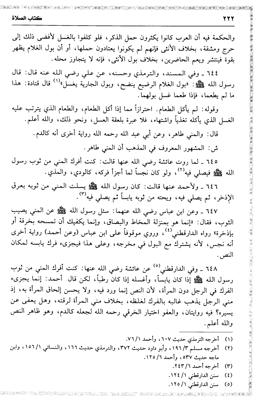 647 وعن ابن عباس رضي الله عنهما : سئل رسول الله عن المني يصيب الثوب ، فقال : ( إنما هو بمنزلة المخاط والبصاق ، وإنما يكفيك أن تمسحه بخرقة أو بإذخرة ) رواه الدارقطني ، وروي موقوفاً على ابن عباس ( وعن أحمد ) رواية أخرى أنه نجس ، لأنه يشترك مع البول في مخرجه ، وعلى هذا فيجزيء فرك يابسه لمكان النص .