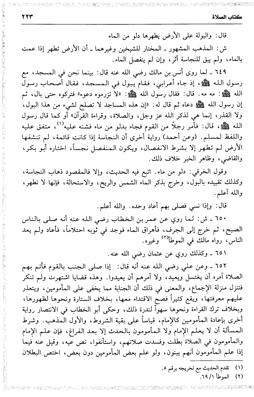 649 لما روى أنس [ بن مالك رضي الله عنه ] قال : بينما نحن في المسجد ، مع رسول الله ، إذ جاء أعرابي ، فقام يبول في المسجد ، فقال أصحاب رسول الله : مه مه . قال : فقال رسول الله : ( لا تزرموه [ دعوه ] ) فتركوه حتى بال ، ثم إن رسول الله دعاه ثم قال له : ( إن هذه المساجد لا تصلح لشيء من هذا البول ، ولا القذر ، إنما هي لذكر الله عز وجل ، والصلاة ، وقراءة القرآن ) أو كما قال رسول الله ، قال : فأمر رجلًا من القوم فجاء بدلو من ماء فشنه عليه ، متفق عليه واللفظ لمسلم . ( وعن أحمد ) رواية أخرى أن النجاسة إذا كانت قائمة ، لم تنشفها الأرض لم تطهر إلا بشرط الانفصال ، ويكون المنفصل نجساً ، اختاره أبو بكر ، والقاضي ، وظاهر الخبر خلاف ذلك .