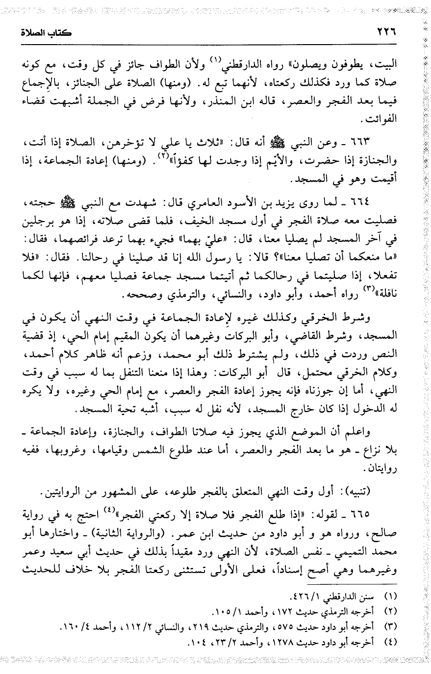 البيت ، يطوفون ويصلون ) رواه الدارقطني ولأن الطواف جائز في كل وقت ، مع كونه صلاة [ كما ] ورد فكذلك ركعتاه ، لأنهما تبع له . ( ومنها ) الصلاة على الجنائز ، بالإِجماع فيما بعد الفجر والعصر ، قاله ابن المنذر ، ولأنها فرض في الجملة أشبهت قضاء الفوائت .