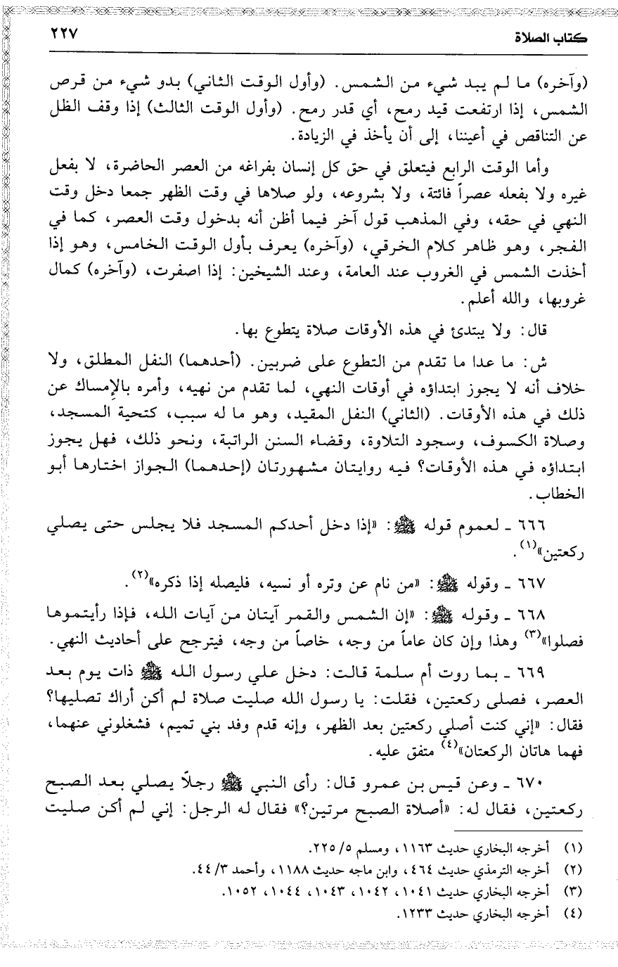 670 وعن قيس بن عمرو قال : رأى النبي رجلًا يصلي بعد الصبح ركعتين ، فقال له : ( أصلاة الصبح مرتين ؟ ) فقال له الرجل : إني لم أكن صليت