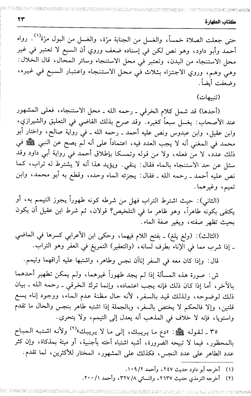 ( أحدها ) قد شمل كلام الخرقي رحمه الله محل الإستنجاء ، فعلى المشهور عند الأصحاب : يغسل سبعاً كغيره . وقد صرح بذلك الثاضي في التعليق والشيرازي ، وابن عقيل ، وابن عبدوس ونص عليه أحمد رحمه الله في رواية صالح ، واختار أبو محمد في المغني أنه لا يجب العدد فيه ، اعتماداً على أنه لم يصح عن النبي في ذلك عدد ، لا من فعله ، ولا من قوله وتمسكا بإطلاق أحمد في رواية أبي داود وقد سئل عن حد الاستنجاء بالماء فقال : ينقي . ويؤيد هذا أنه لا يشترط له تراب ، كما نص عليه أحمد رحمه الله فقال : يجزئه الماء وحده ، وقطع به أبو محمد ، وابن تميم ، وغيرهما .
