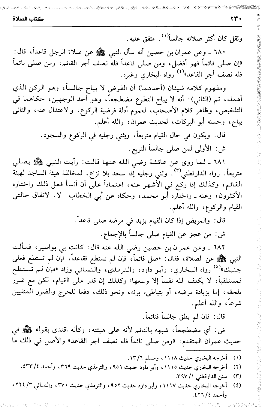 680 وعن عمران بن حصين أنه سأل النبي عن صلاة الرجل قاعداً ، قال : ( إن صلى قائماً فهو أفضل ، ومن صلى قاعداً فله نصف أجر القائم ، ومن صلى نائماً فله نصف أجر القاعد ) رواه البخاري وغيره .