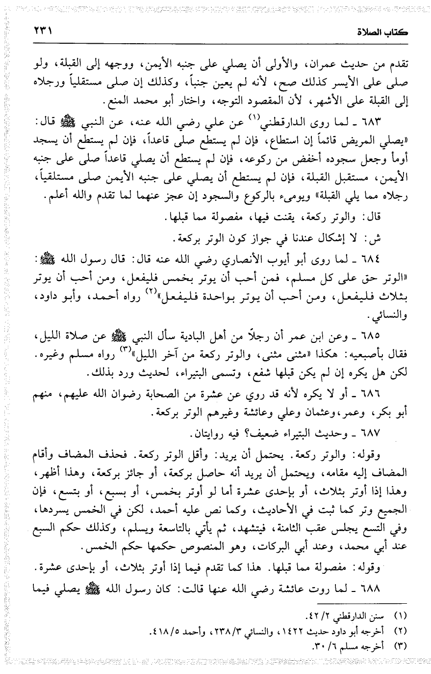 684 لما روى أبو أيوب الأنصاري رضي الله عنه قال : قال رسول الله : ( الوتر حق على كل مسلم ، فمن أحب أن يوتر بخمس فليفعل ، ومن أحب أن يوتر بثلاث فليفعل ، ومن أحب أن يوتر بواحدة فليفعل ) رواه أحمد ، وأبو داود ، والنسائي .