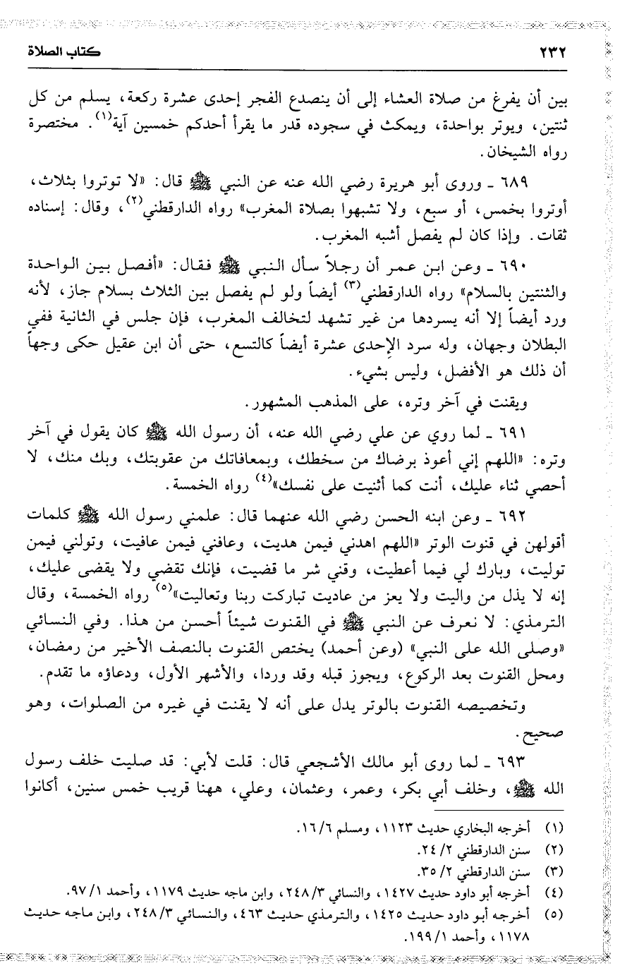 691 لما روى عن علي رضي الله عنه ، أن رسول الله كان يقول في آخر وتره : ( اللهم إني أعوذ برضاك من سخطك ، وبمعافاتك من عقوبتك ، وبك منك ، لا أحصي ثناء عليك ، أنت كما أثنيت على نفسك ) رواه الخمسة .