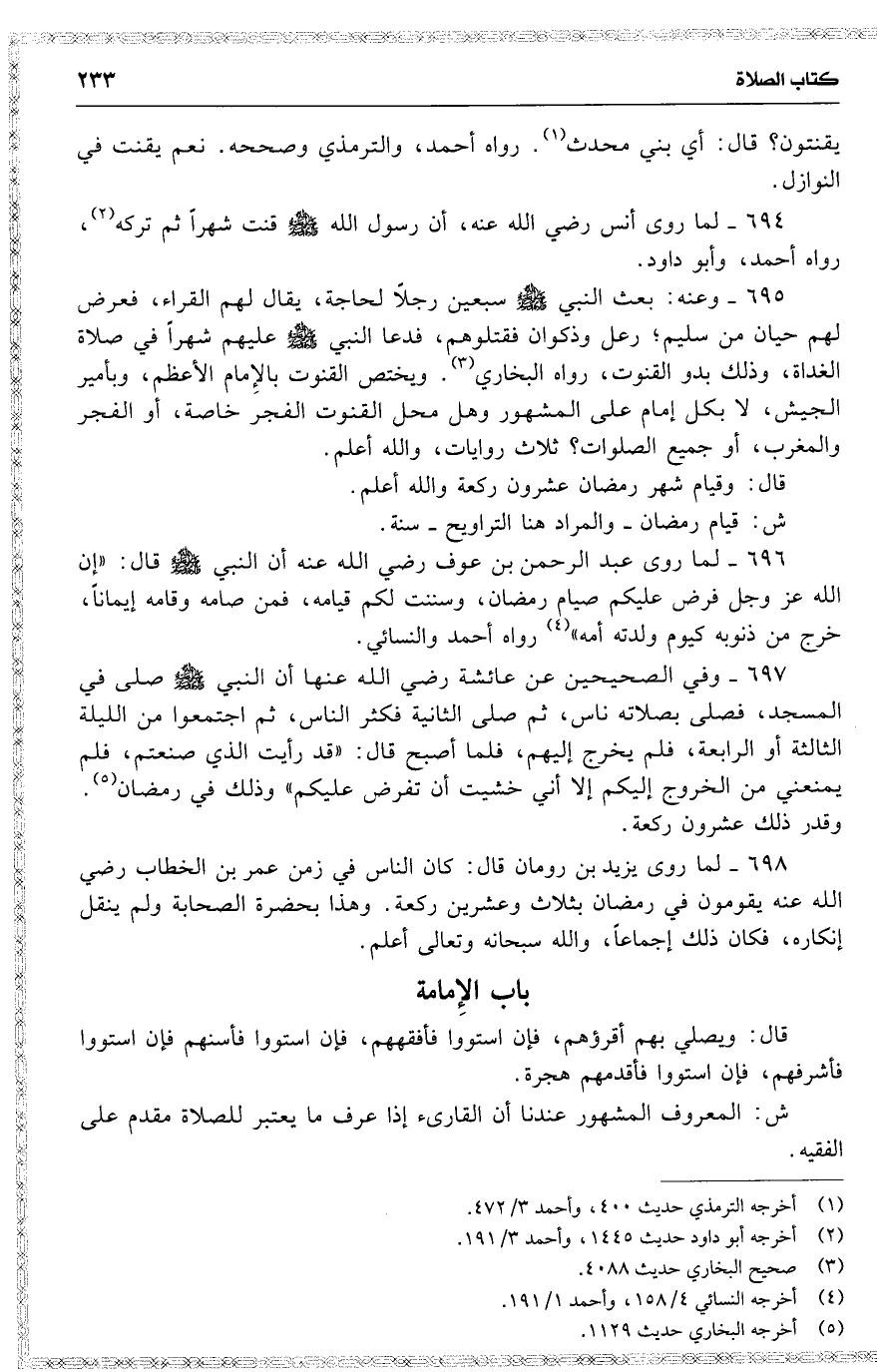 695 وعنه : بعث النبي [ ] سبعين رجلًا لحاجة ، يقال لهم القراء ، فعرض لهم حيان من سليم ؛ رعل وذكوان فقتلوهم ، فدعا النبي عليهم شهراً في صلاة الغداة ، وذلك بدو القنوت ، رواه البخاري . ويختص القنوت بالإِمام الأعظم ، وبأمير الجيش ، لا بكل إمام وهل محل القنوت الفجر خاصة ، أو الفجر والمغرب ، أو جميع الصلوات ؟ ثلاث روايات ، .
