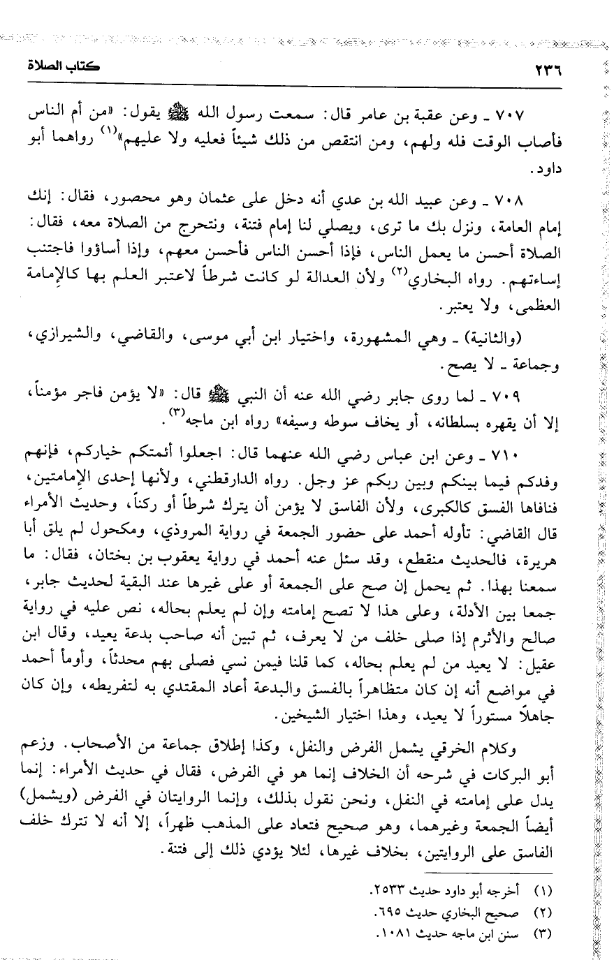 707 وعن عقبة بن عامر قال : سمعت رسول الله يقول : ( من أم الناس فأصاب الوقت فله ولهم ، ومن انتقص من ذلك شيئاً فعليه ولا عليهم ) رواهما أبو داود .
