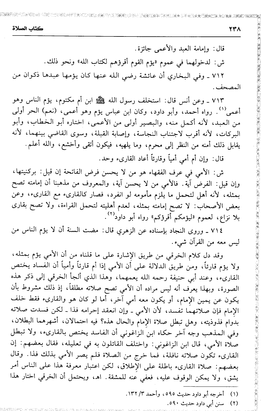 713 وعن أنس قال : استخلف رسول الله ابن أم مكتوم ، يؤم الناس وهو أعمى . رواه أحمد ، وأبو داود ، وكان ابن عباس يؤم وهو أعمى ، ( نعم ) الحر أولى من العبد ، لأنه أكمل منه ، والبصير أولى من الأعمى ، اختاره أبو الخطاب ، وأبو البركات ، لأنه أقرب لاجتناب النجاسة ، وإصابة القبلة ، وسوى القاضي بينهما ، لأنه يقابل ذلك أمنه من النظر إلى محرم ، وما يلهيه ، فيكون أتقى وأخشع ، والله أعلم .