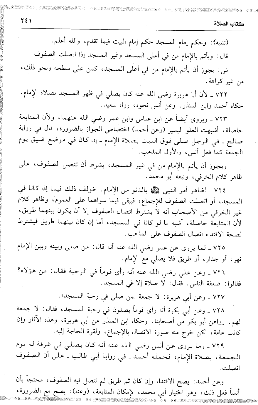 727 أنه كان يصلي في غرفة له يوم الجمعة ، بصلاة الإِمام ، فحمله أحمد في رواية أبي طالب على أن الصفوف اتصلت .
