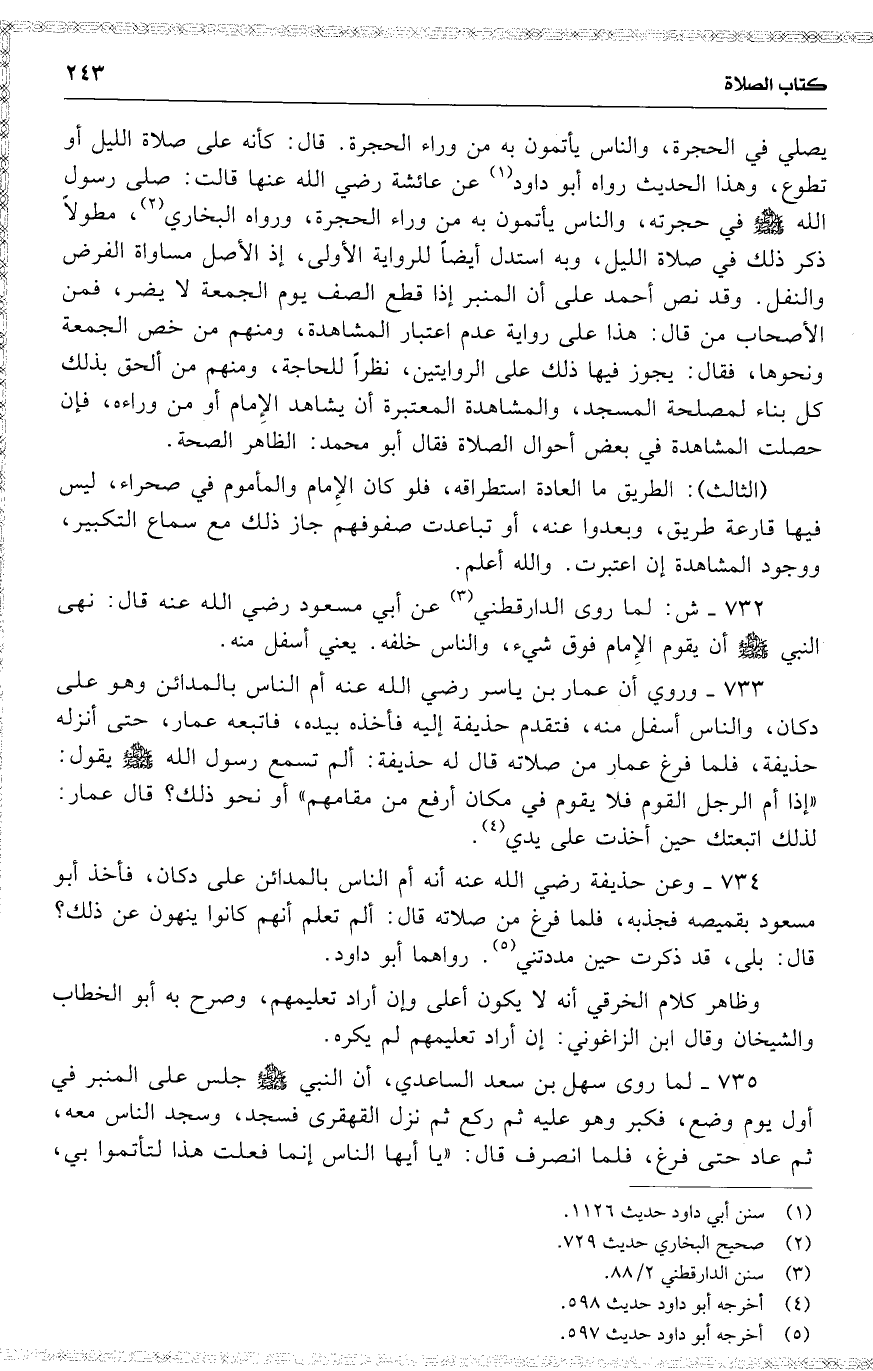 732 ش : لما روى الدارقطني عن أبي مسعود رضي الله عنه قال : نهى النبي أن يقوم الإِمام فوق شيء ، والناس خلفه . يعني أسفل منه .