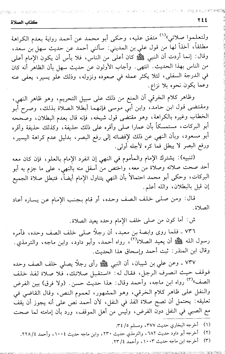 ولتعلموا صلاتي ) متفق عليه ، وحكى أبو محمد عن أحمد رواية بعدم الكراهة مطلقاً ، أخذا لها من قول علي بن المديني : سألني أحمد عن حديث سهل بن سعد ، وقال : إنما أردت أن النبي كان أعلى من الناس ، فلا بأس أن يكون الإِمام أعلى من الناس بهذا الحديث . انتهى . وأجاب الأولون عن حديث سهل بأن الظاهر أنه كان في الدرجة السفلى ، لئلا يكثر عمله في صعوده ونزوله ، وذلك علو يسير ، يعفى عنه وعما يكون نحوه بلا نزاع .