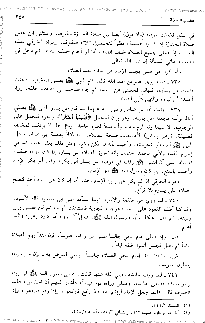 738 فلما روى جابر بن عبد الله قال : قام النبي يصلي المغرب ، فجئت فقمت عن يساره ، فنهاني فجعلني عن يمينه ، ثم جاء صاحب لي فصففنا خلفه . رواه أحمد وغيره ، والنهي دليل الفساد .