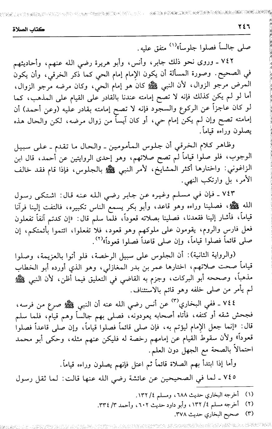 743 فإن في مسلم وغيره [ عن جابر رضي الله عنه ] قال : اشتكى رسول الله ، فصلينا وراءه وهو قاعد ، وأبو بكر يسمع الناس تكبيره ، فالتفت إلينا فرآنا قياماً ، فأشار إلينا فقعدنا ، فصلينا بصلاته قعوداً ، فلما سلم قال : ( إن كدتم آنفاً تفعلون فعل فارس والروم ، يقومون على ملوكهم وهو قعود ، فلا تفعلوا ، ائتموا بأئمتكم ، إن صلى قائماً فصلوا قياماً ، وإن صلى قاعداً فصلوا قعوداً ) .