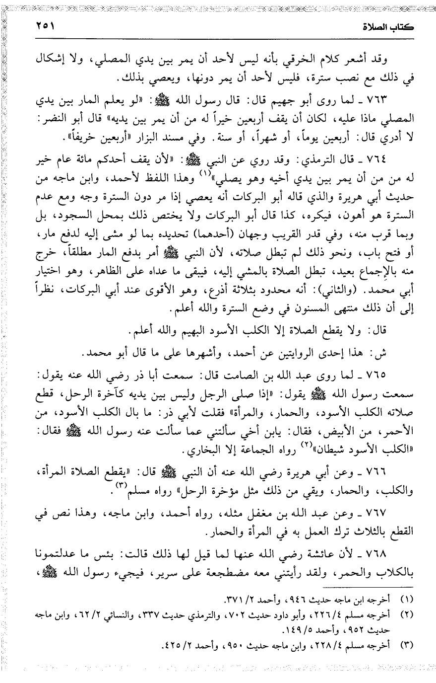 764 [ قال الترمذي ] : وقد روي عن النبي ( لأن يقف أحدكم مائة عام خير له [ من ] من أن يمر بين يدي أخيه وهو يصلي ) وهذا اللفظ لأحمد ، وابن ماجه من حديث أبي هريرة [ والذي قاله أبو البركات أنه يعصي إدا مر دون السترة وجه ] [ ومع عدم السترة ] هو أهو ، فيكره ، كذا قال أبو البركات ولا يختص ذلك بمحل السجود ، بل وبما قرب منه ، وفي قدر القريب وجهان ( أحدهما ) تحديده بما لو مشى إليه لدفع مار ، أو فتح باب ، ونحو ذلك لم تبطل صلاته ، لأن النبي أمر بدفع المار مطلقاً ، خرج منه بالإِجماع بعيد ، تبطل الصلاة بالمشي إليه ، فيبقى ما عداه على الظاهر ، وهو اختيار أبي محمد . ( والثاني ) : أنه محدود بثلاثة أذرع ، وهو الأقوى عند أبي البركات ، نظراً إلى أن ذلك منتهى المسنون في وضع السترة والله أعلم .