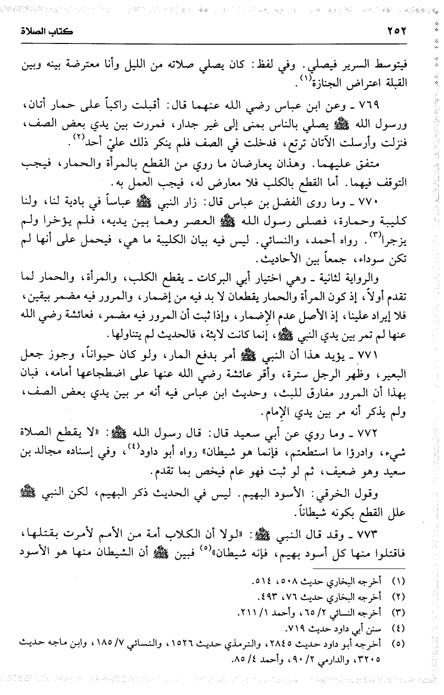 769 وعن ابن عباس [ رضي الله عنهما ] قال : 6 ( أقبلت راكباً على حمار أتان ، ورسول الله يصلي بالناس بمنى إلى غير جدار ، فمررت بين يدي بعض الصف ، [ فنزلت ] وأرسلت الآتان ترتع ، فدخلت في الصف فلم ينكر ذلك عليّ أحد . )