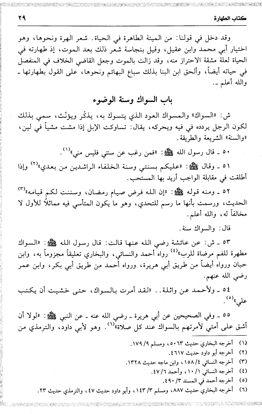 53 ش : عن عائشة رضي الله عنها قالت : قال رسول الله : ( السواك مطهرة للفم مرضاة للرب ) رواه أحمد والنسائي ، والبخاري تعليقاً مجزوماً به ، وابن حبان ورواه أيضاً من طريق أبي هريرة ، ورواه أحمد من طريق أبي بكر ، وابن عمر رضي الله عنهم .