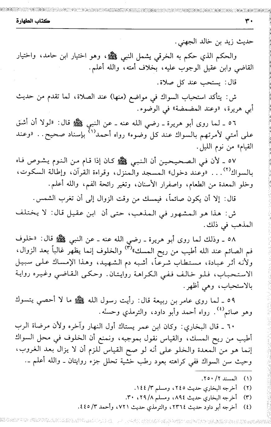 56 لما روى أبو هريرة رضي الله عنه عن النبي قال : ( لولا أن أشق على أمتي لأمرتهم بالسواك عند كل وضوء ) رواه أحمد بإسناد صحيح . . ( وعند القيام ) من نوم الليل .
