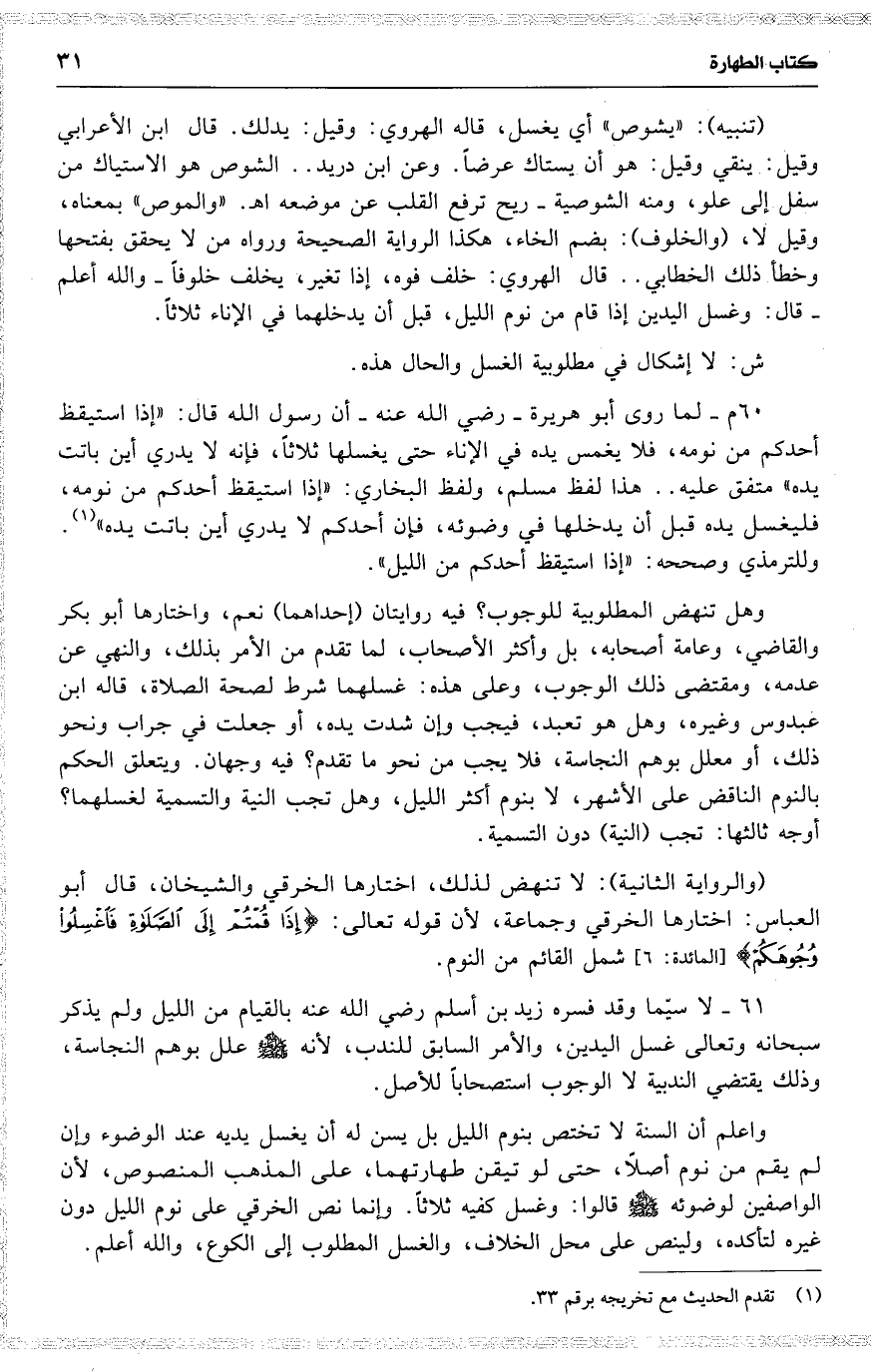 61 لا سيّما وقد فسره زيد بن أسلم رضي الله عنه بالقيام من الليل ولم يذكر سبحانه وتعالى غسل اليدين ، والأمر السابق للندب ، لأنه علل بوهم النجاسة ، وذلك يقتضي الندبية لا الوجوب استصحاباً للأصل .