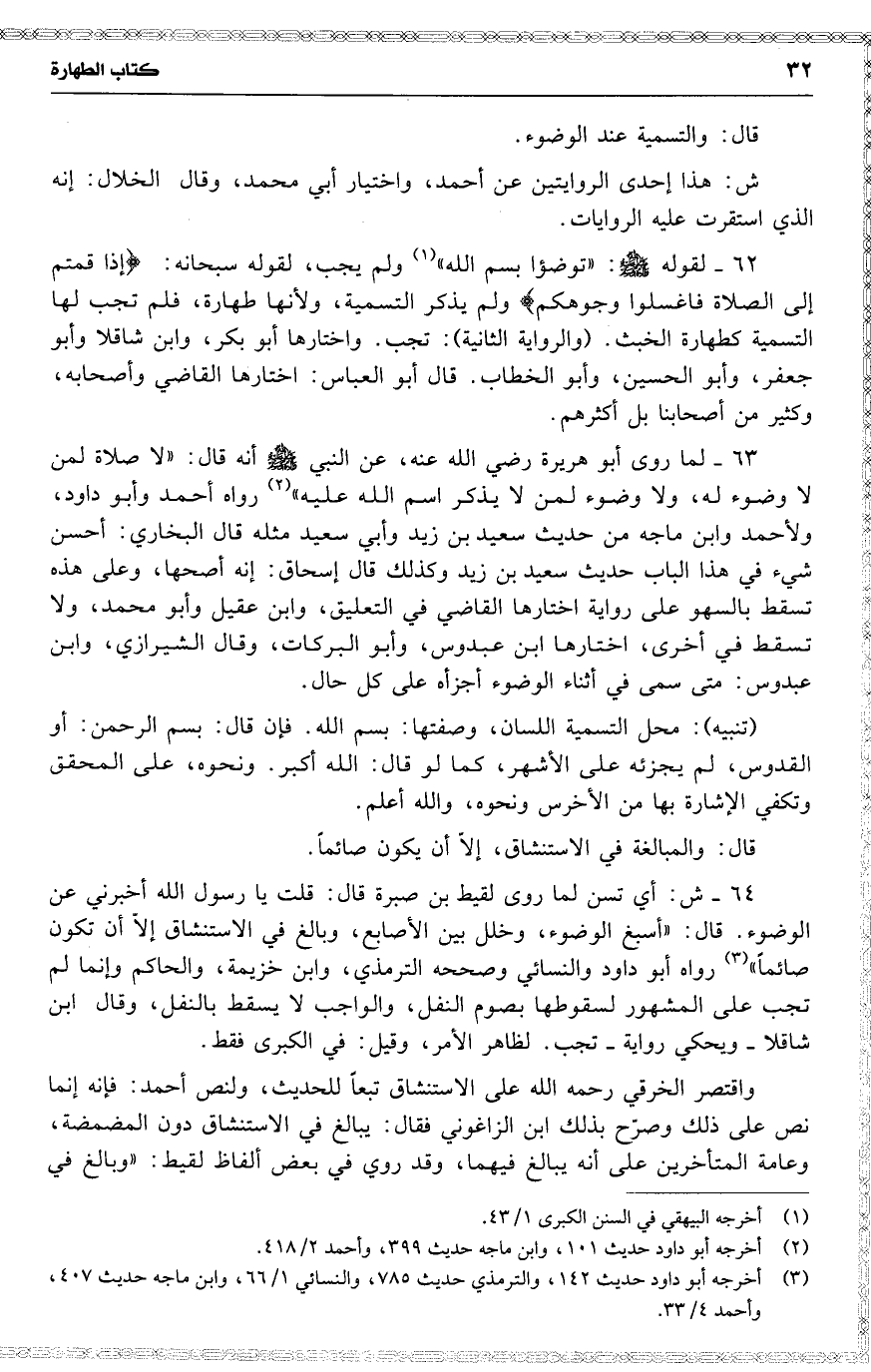 63 لما روى أبو هريرة رضي الله عنه ، عن النبي أنه قال : ( لا صلاة لمن لا وضوء له ، ولا وضوء لمن لا يذكر اسم الله عليه ) رواه أحمد وأبو داود ، ولأحمد وابن ماجه من حديث سعيد بن زيد [ وأبي سعيد مثله قال البخاري : أحسن شيء في هذا الباب حديث سعيد بن زيد ] وكذلك قال إسحاق : إنه أصحها ، وعلى هذه تسقط بالسهو على رواية اختارها القاضي في التعليق ، وابن عقيل وأبو محمد ، ولا تسقط في أخرى ، اختارها ابن عبدوس ، وأبو البركات ، وقال الشيرازي ، و ابن عبدوس : متى سمى في أثناء الوضوء أجزأه على كل حال .