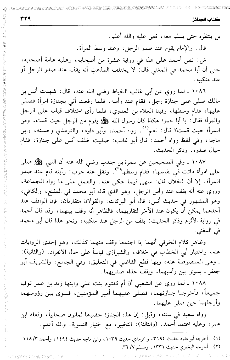 1086 لما روي عن أبي غالب الخياط رضي الله عنه ، قال : شهدت أنس بن مالك صلى على جنازة رجل ، فقام عند رأسه ، فلما رفعت أتي بجنازة امرأة فصلى عليها ، فقام وسطها ، وفينا العلاء بن العدوي ، فلما رأى اختلاف قيامه على الرجل والمرأة فقال : يا أبا حمزة هكذا كان رسول الله يقوم من الرجل حيث قمت ، ومن المرأة حيث قمت ؟ قال : نعم . رواه أحمد ، وأبو داود ، والترمذي وحسنه ، وابن ماجه ، وفي لفظ رواه أحمد : قال أبو غالب : صليت خلف أنس على جنازة ، فقام حيال صدره . وذكر الحديث .