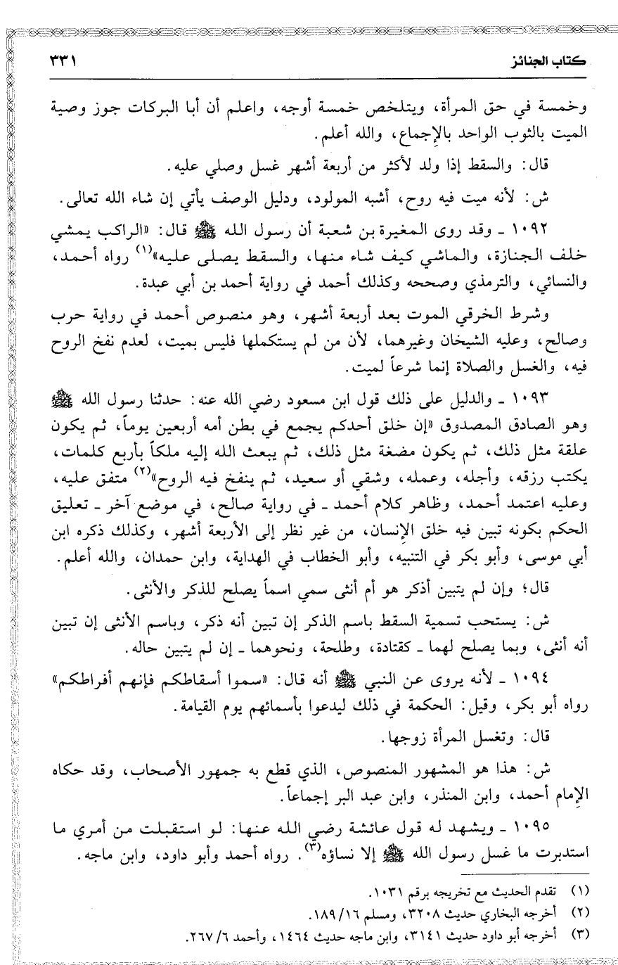 1093 والدليل على ذلك قول ابن مسعود رضي الله عنه : حدثنا رسول الله [ وهو ] الصادق المصدوق ( إن خلق أحدكم يجمع في بطن أمه أربعين يوماً ، ثم يكون علقة مثل ذلك ، ثم يكون مضغة مثل ذلك ، ثم يبعث الله إليه ملكاً بأربع كلمات ، يكتب رزقه ، وأجله ، وعمله ، وشقي أو سعيد ، ثم ينفخ فيه الروح ) متفق عليه ، وعليه اعتمد أحمد ، وظاهر كلام أحمد في رواية صالح ، في موضع آخر تعليق الحكم بكونه تبين فيه خلق الإِنسان ، من غير نظر إلى الأربعة أشهر ، وكذلك ذكره ابن أبي موسى ، وأبو بكر في التنبيه ، وأبو الخطاب في الهداية ، وابن حمدان ، والله أعلم .