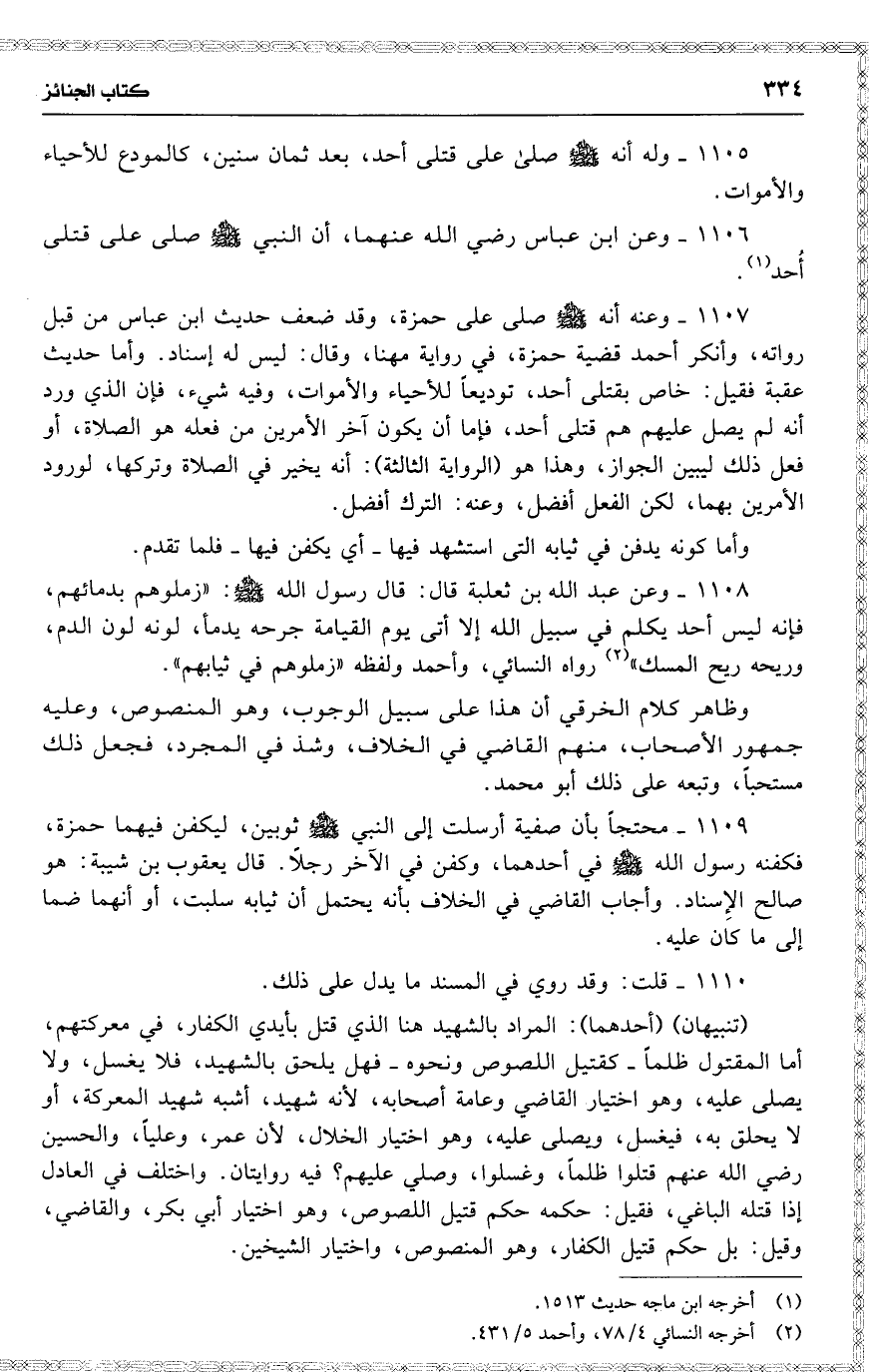 1108 وعن عبد الله بن ثعلبة قال : قال رسول الله : ( زملوهم بدمائهم ، فإنه ليس أحد يكلم في سبيل الله إلا أتى يوم القيامة جرحه يدمأ ، لونه لون الدم ، وريحه ريح المسك ) رواه النسائي ، وأحمد ولفظه ( زملوهم في ثيابهم ) .
