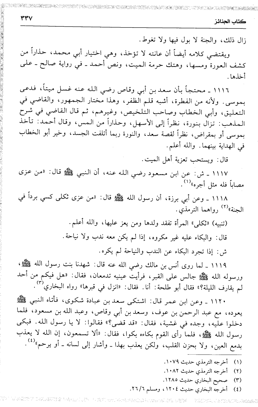 1118 وعن أبي برزة ، أن رسول الله قال : ( من عزى ثكلى كسي بردافي الجنة ) رواهما الترمذي .