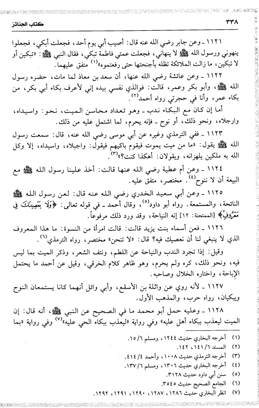 1126 فعن أسماء بنت يزيد قالت : قالت امرأة من النسوة : ما هذا المعروف الذي لا ينبغي لنا أن نعصيك فيه ؟ قال : ( لا تنحن ) مختصر ، رواه الترمذي .