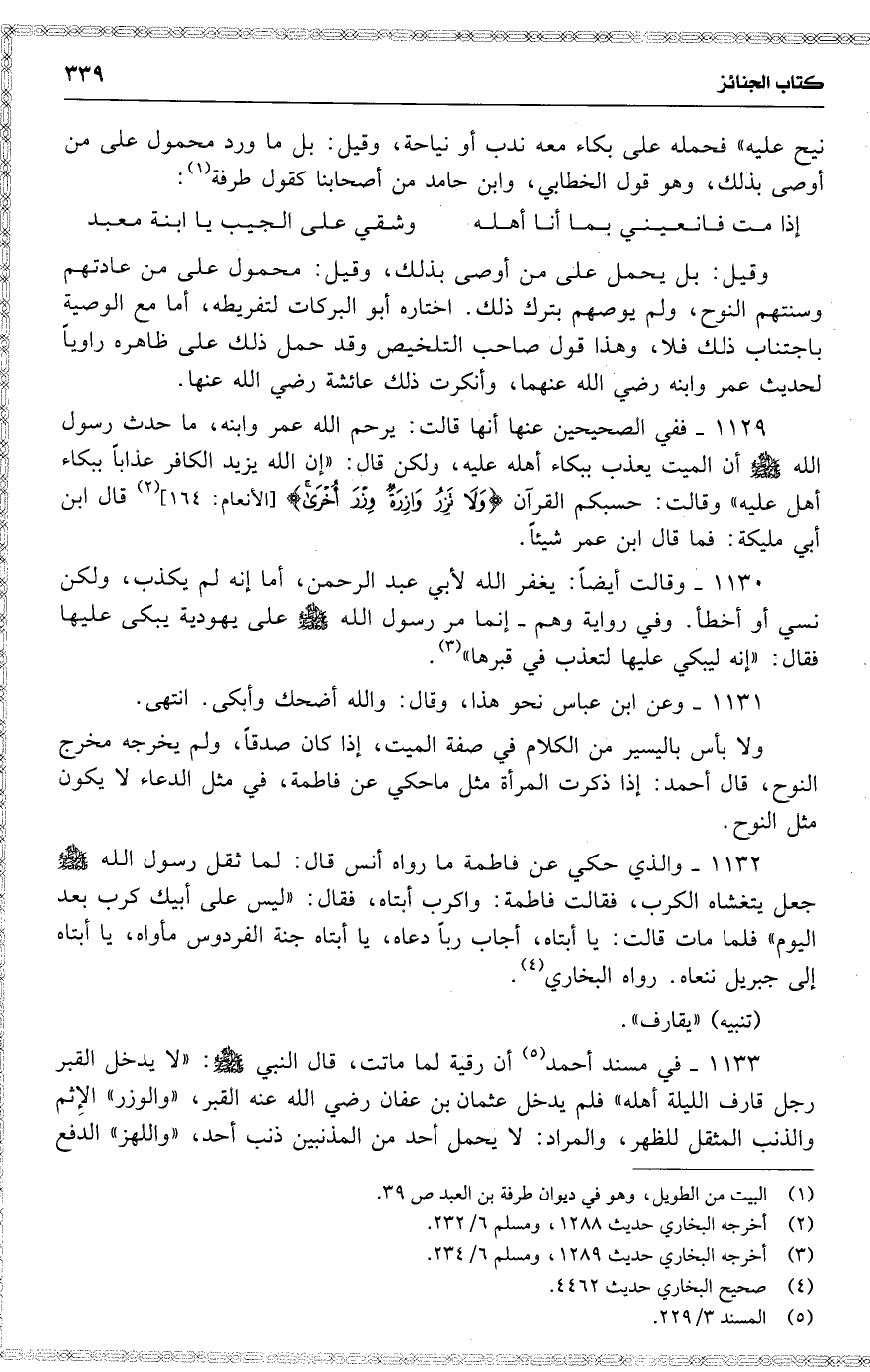 1129 ففي الصحيحين عنها أنها قالت : يرحم الله عمر وابنه ، ما حدث رسول الله أن الميت يعذب ببكاء أهله عليه ، ولكن قال : ( إن الله يزيد الكافر عذاباً ببكاء أهل عليه ) وقالت : حسبكم القرآن ( ولا تزر وازرة وزر أخرى ) قال ابن أبي مليكة : فما قال ابن عمر شيئاً .