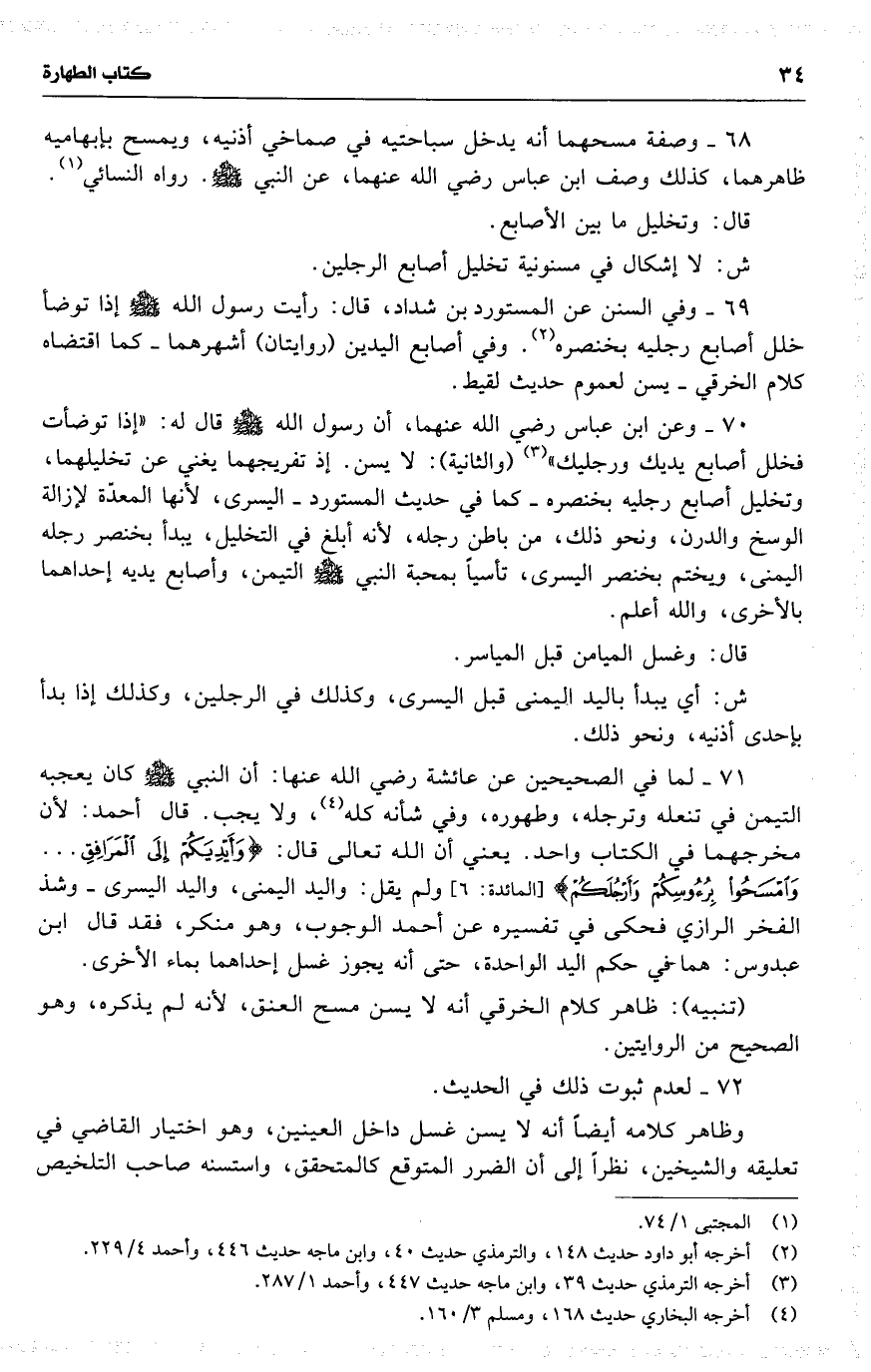 70 وعن ابن عباس رضي الله عنهما ، أن رسول الله قال له : ( إذا توضأت فخلل أصابع يديك ورجليك ) ( والثانية ) : لا يسن . إذ تفريجهما يغني عن تخليلهما ، وتخليل أصابع رجليه بخنصره كما في حديث المستورد اليسرى ، لأنها المعدّة لإزالة الوسخ والدرن ، ونحو ذلك ، من باطن رجله ، لأنه أبلغ في التخليل ، يبدأ بخنصر رجله اليمنى ، ويختم بخنصر اليسرى ، تأسياً بمحبة النبي التيمن ، وأصابع يديه إحداهما بالأخرى ، والله أعلم .