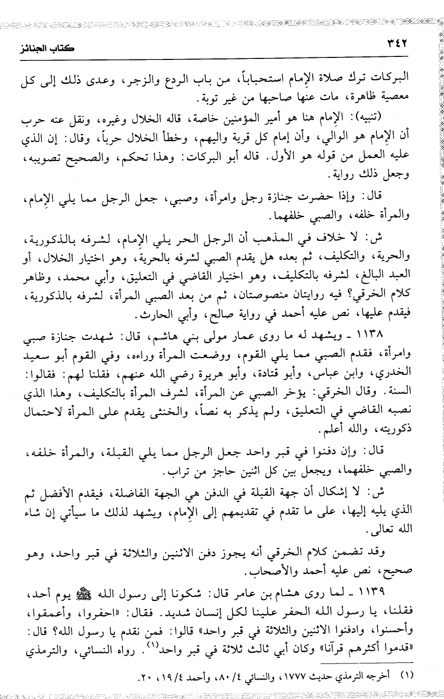 1139 لما روى هشام بن عامر قال : شكونا إلى رسول الله يوم أحد ، فقلنا ، يا رسول الله الحفر علينا لك إنسان شديد . فقال : ( احفروا ، وأعمقوا ، وأحسنوا ، وادفنوا الاثنين والثلاثة في قبر واحد ) قالوا : فمن نقدم يا رسول الله ؟ قال : ( قدموا أكثرهم قرآنا ) وكان أبي ثالث ثلاثة في قبر واحد . رواه النسائي ، والترمذثي