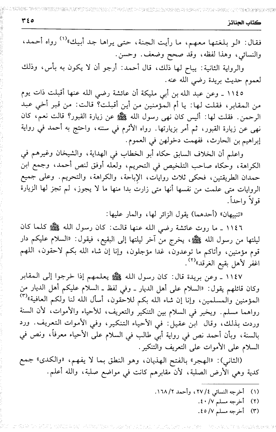 1145 وعن عبد الله بن أبي مليكة أن عائشة رضي الله عنها 16 ( أقبلت ذات يوم من المقابر ، فقلت لها : يا أم المؤمنين من أين أقبلت ؟ قالت : من قبر أخي عبد الرحمن . فقلت لها : أليس كان نهى رسول الله عن زيارة القبور ؟ قالت نعم ، كان نهى عن زيارة القبور ، ثم أمر بزيارتها ) . رواه الأثرم في سننه ، واحتج به أحمد في رواية إبراهيم بن الحارث ، ففهمت دخولهن في العموم .