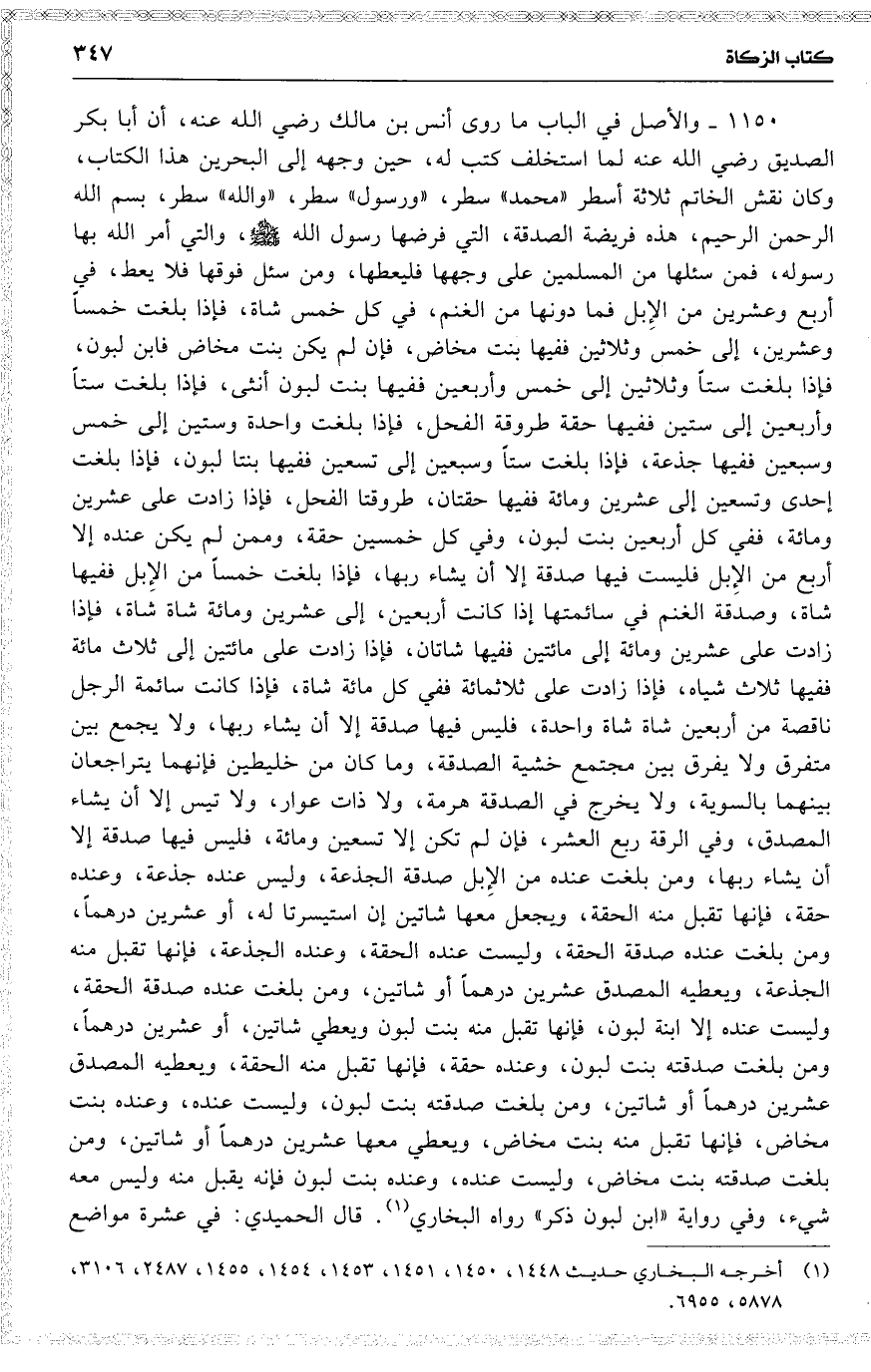 1150 والأصل في الباب ما روى أنس بن مالك رضي الله عنه ، [ أن أبا بكر الصديق رضي الله عنه ] لما استخلف كتب له ، جين وجهه إلى البحرين هذا الكتاب ، وكان نقش الخاتم ثلاثة أسطر ( محمد ) سطر ، ( ورسول ) سطر ، ( والله ) سطر ، بسم الله الرحمن الرحيم ، هذه فريضة الصدقة ، التي فرضها رسول الله ، والتي أمر الله بها رسوله ، فمن سئلها من المسلمين على وجهها فليعطها ، ومن سئل فوقها فلا يعط ، في أربع وعشرين من الإِبل فما دونها من الغنم ، في كل خمس شاة ، فإذا بلغت خمساً وعشرين ، إلى خمس وثلاثين ففيها بنت مخاض ، فإن لم يكن بنت مخاض فابن لبون ، فإذا بلغت ستاً وثلاثين إلى خمس وأربعين ففيها بنت لبون أنثى ، فإذا بلغت ستاً وأربعين إلى ستين ففيها حقة طروقة الفحل ، فإذا بلغت واحدة وستين إلى خمس وسبعين ففيها جذعة ، فإذا بلغت ستاً وسبعين إلى تسعين ففيها بنتاً لبون ، فإذا بلغت إحدى وتسعين إلى عشرين ومائة ففيها حقتان ، طروقتا الفحل ، فإذا زادت على عشرين ومائة ، ففي كل أربعين بنت لبون ، وفي كل خمسين حقة ، وممن لم يكن عنده إلا أربع من الإِبل فليست فيها صدقة إلا أن يشاء ربها ، فإذا بلغت خمساً من الإِبل ففيها شاة ، وصدقة الغنم في سائمتها إذا كانت أربعين ، إلى عشرين ومائة شاة شاة ، فإذا زادت على عشرين ومائة إلى مائتين ففيها شاتان ، فإذا زادت على مائتين إلى ثلاث مائة ففيها ثلاث شياه ، فإذا زادت على ثلاثمائة ففي كل مائة شاة ، فإذا كانت سائمة الرجل ناقصة من أربعين شاة شاة واحدة ، فليس فيها صدقة إلا أن يشاء ربها ، ولا يجمع بين متفرق ولا يفرق بين مجتمع خشية الصدقة ، وما كان من خليطين فإنهما يتراجعان بينهما بالسوية ، ولا يخرج في الصدقة هرمة ، ولا ذات عوار ، ولا تيس إلا أن يشاء المصدق ، وفي الرقة ربع العشر ، فإن لم تكن إلا تسعين ومائة ، فليس فيها صدقة إلا أن يشاء ربها ، ومن بلغت عنده من الإِبل صدقة الجذعة ، وليس عنده جذعة ، وعنده حقة ، فإنها تقبل منه الحقة ، ويجعل معها شاتين إن استيسرتا له ، أو عشرين درهماً ، ومن بلغت عنده صدقة الحقة ، وليست عنده الحقة ، وعنده الجذعة ، فإنها تقبل منه الجذعة ، ويعطيه المصدق عشرين درهماً أو شاتين ، ومن بلغت عنده صدقة الحقة ، وليست عنده إلا ابنة لبون ، فإنها تقبل منه بنت لبون ويعطي شاتين ، أو عشرين درهماً ، ومن بلغت صدقته بنت لبون ، وعنده حقة ، فإنها تقبل منه الحقة ، ويعطيه المصدق عشرين درهماً أو شاتين ، ومن بلغت صدقته بنت لبون ، وليست عنده ، وعنده بنت مخاض ، فإنها تقبل منه بنت مخاض ، ويعطي معها عشرين درهماً أو شاتين ، ومن بلغت صدقته بنت مخاض ، وليست عنده ، وعنده بنت لبون فإنه يقبل منه وليس معه شيء ، وفي رواية ( ابن لبون ذكر ) رواه البخاري . قال الحميدي : في عشرة مواضع