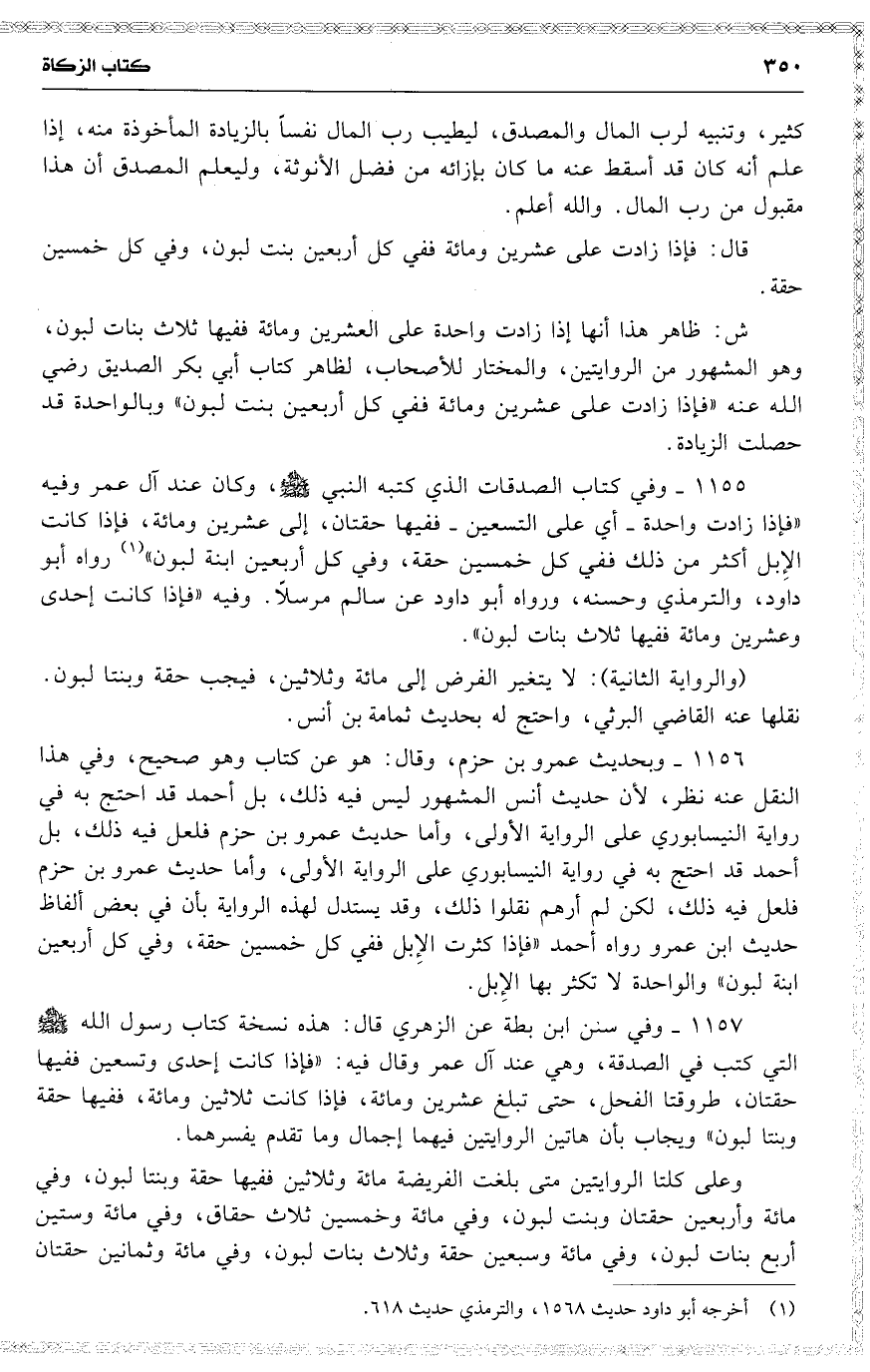 1157 وفي سنن ابن بطة عن الزهري قال : هذه نسخة كتاب رسول الله لتي كتب في الصدقة ، وهي عند آل عمر وقال فيه : ( فإذا كانت إحدى وتسعين ففيها حقتان ، طروقتا الفحل ، حتى تبلغ عشرين ومائة ، فإذا كانت ثلاثين ومائة ، ففيها حقة وبنتاً لبون ) ويجاب بأن هاتين الروايتين فيهما إجمال وما تقدم يفسرهما .