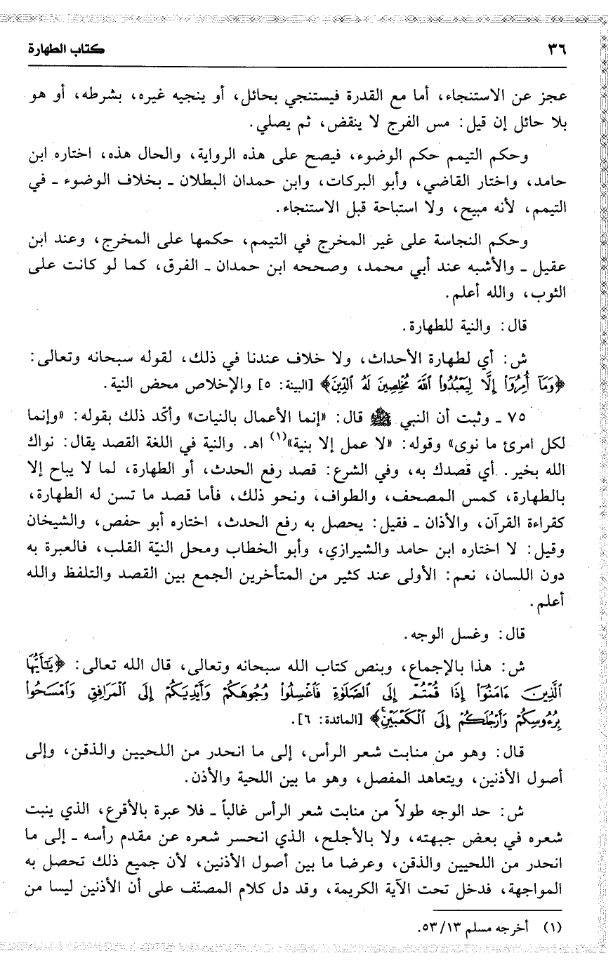 75 وثبت أن النبي قال : ( إنما الأعمال بالنيات ) وأكّد ذلك بقوله : ( وإنما لكل امرئ ما نوى ) وقوله : ( لا عمل إلا بنية ) اه . والنية في اللغة القصد يقال : نواك الله بخير . أي قصدك به ، وفي الشرع : قصد رفع الحدث ، أو الطهارة ، لما لا يباح إلا بالطهارة ، كمس المصحف ، والطواف ، ونحو ذلك ، فأما قصد ما تسن له الطهارة ، كقراءة القرآن ، والأذان فقيل : يحصل به رفع الحدث ، اختاره أبو حفص ، والشيخان وقيل : لا اختاره ابن حامد والشيرازي ، وأبو الخطاب ومحل النيّة القلب ، فالعبرة به دون اللسان ، نعم : الأولى عند كثير من المتأخرين الجمع بين القصد والتلفظ والله أعلم .